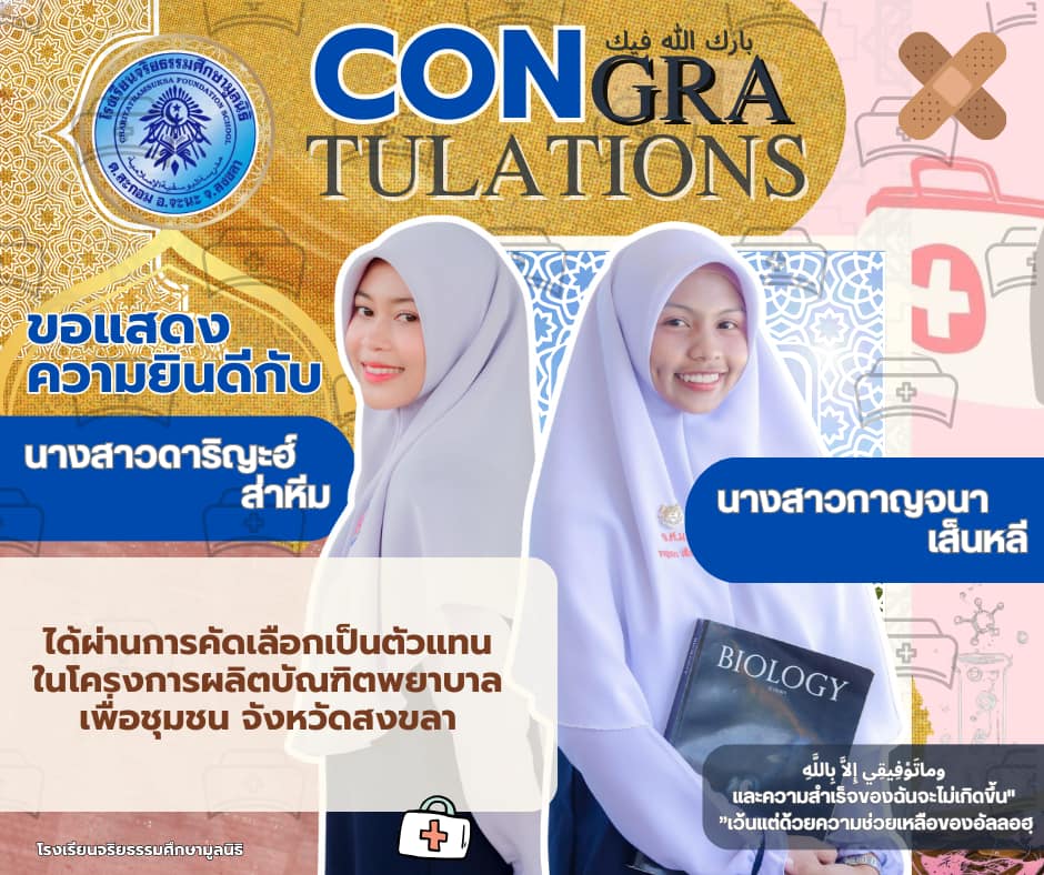 ขอแสดงความยินดีกับนักเรียน ชั้นมัธยมศึกษาปีที่ 6 ที่ได้ผ่านการคัดเลือกเป็นตัวแทนในโครงการผลิตบัณฑิตพยาบาลเพื่อชุมชน จังหวัดสงขลา คณะพยาบาลศาสตร์ มหาวิทยาลัยสงขลานครินทร์